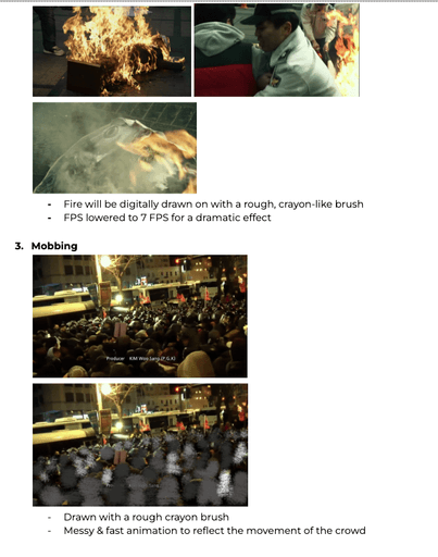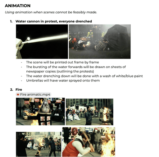 Looking through the original film clip, and liaising with Sal (Director) and Cindy (Producer) to identify what could not be feasibly filmed, and would require animation work. I planned out what animations I'd make before the shoot to maximise preparation, but to also ensure any necessary changes to what needed to be filmed to accomodate to the need for animation could be identified and quickly factored in.