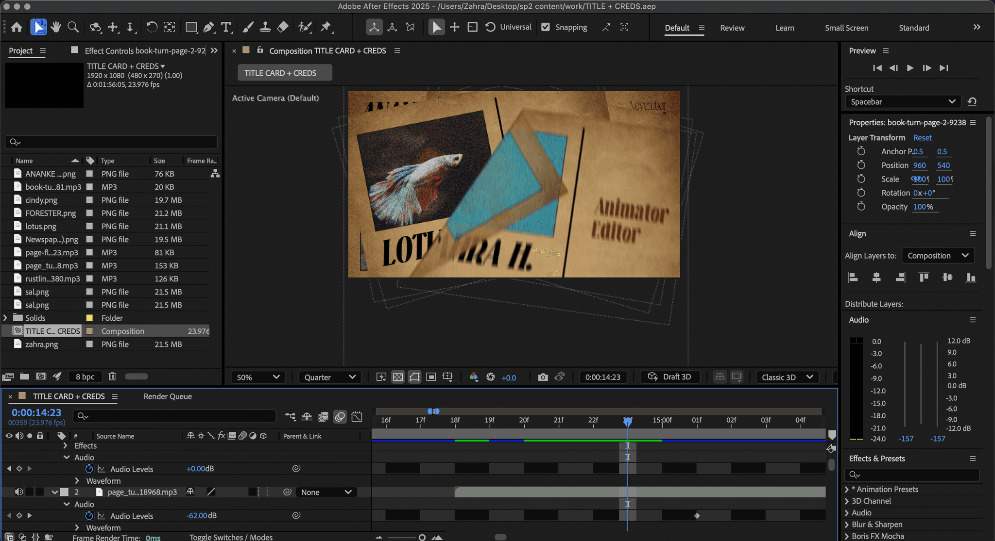 After Effects workspace! MVP of the title card and credits is the effect CC Page turn.