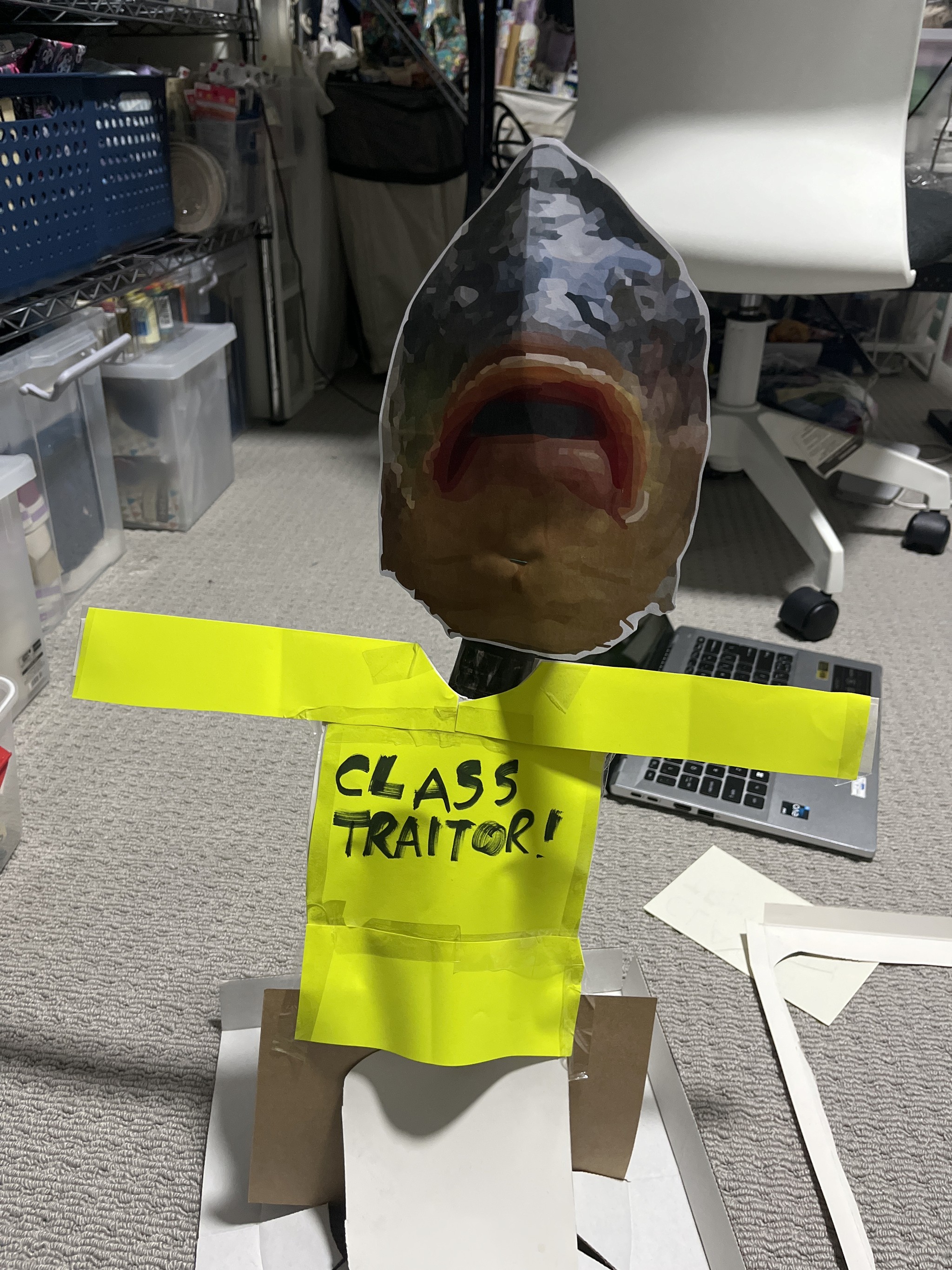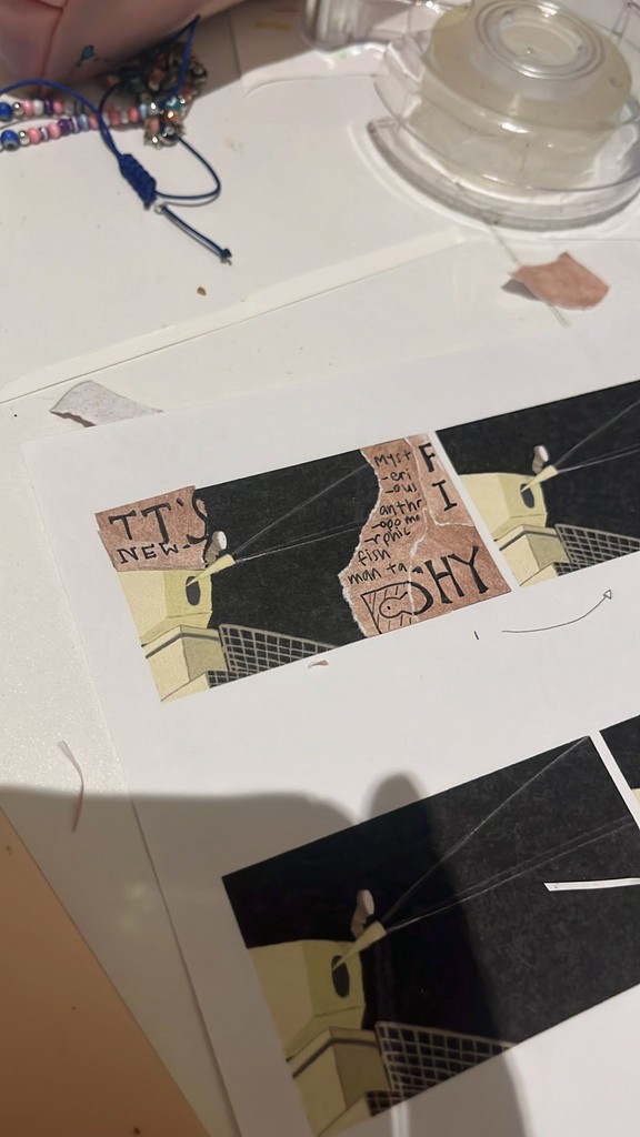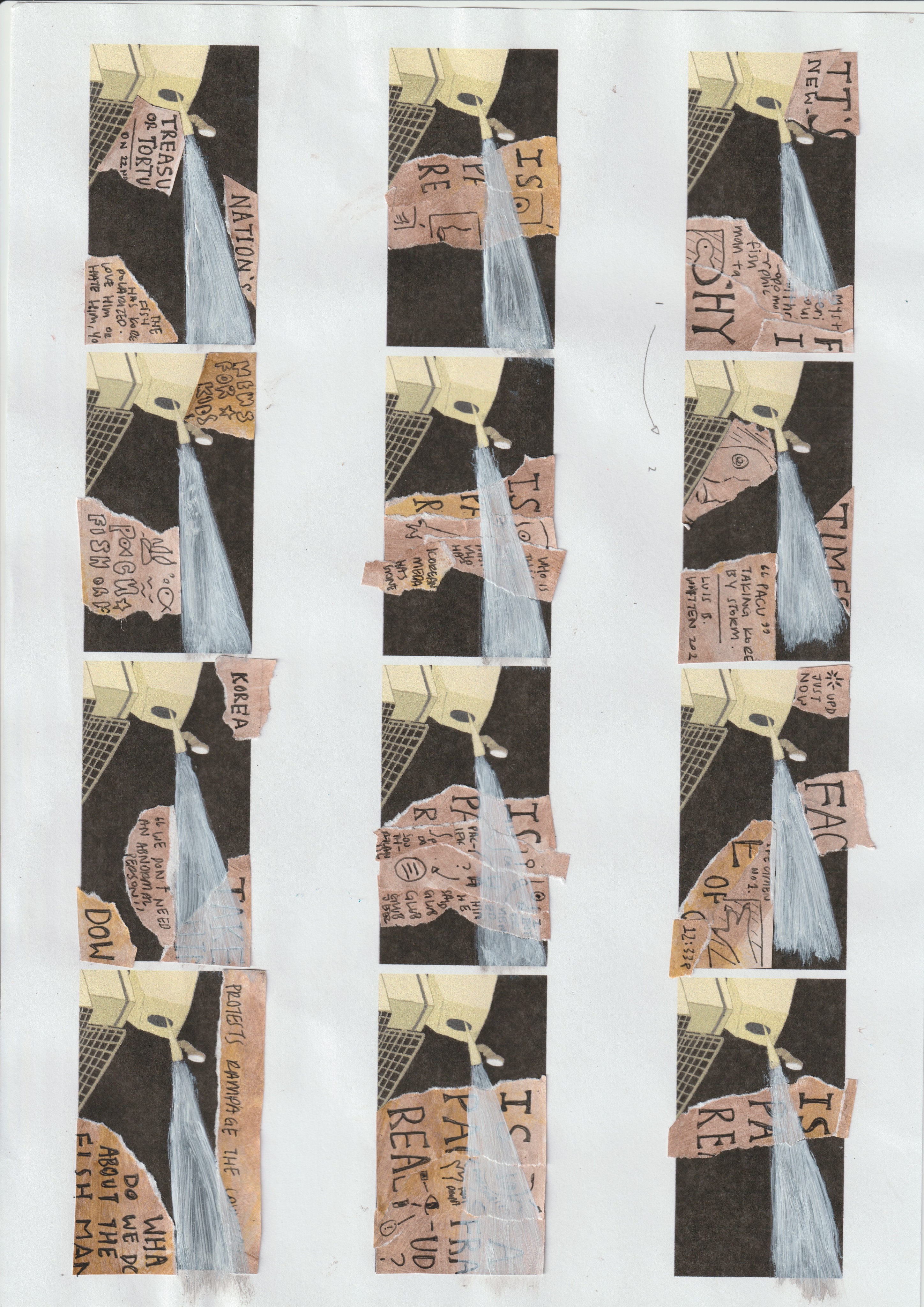 Paint normal paper brown to form newspapers. Rip up, glue, paint, write headlines, repeat