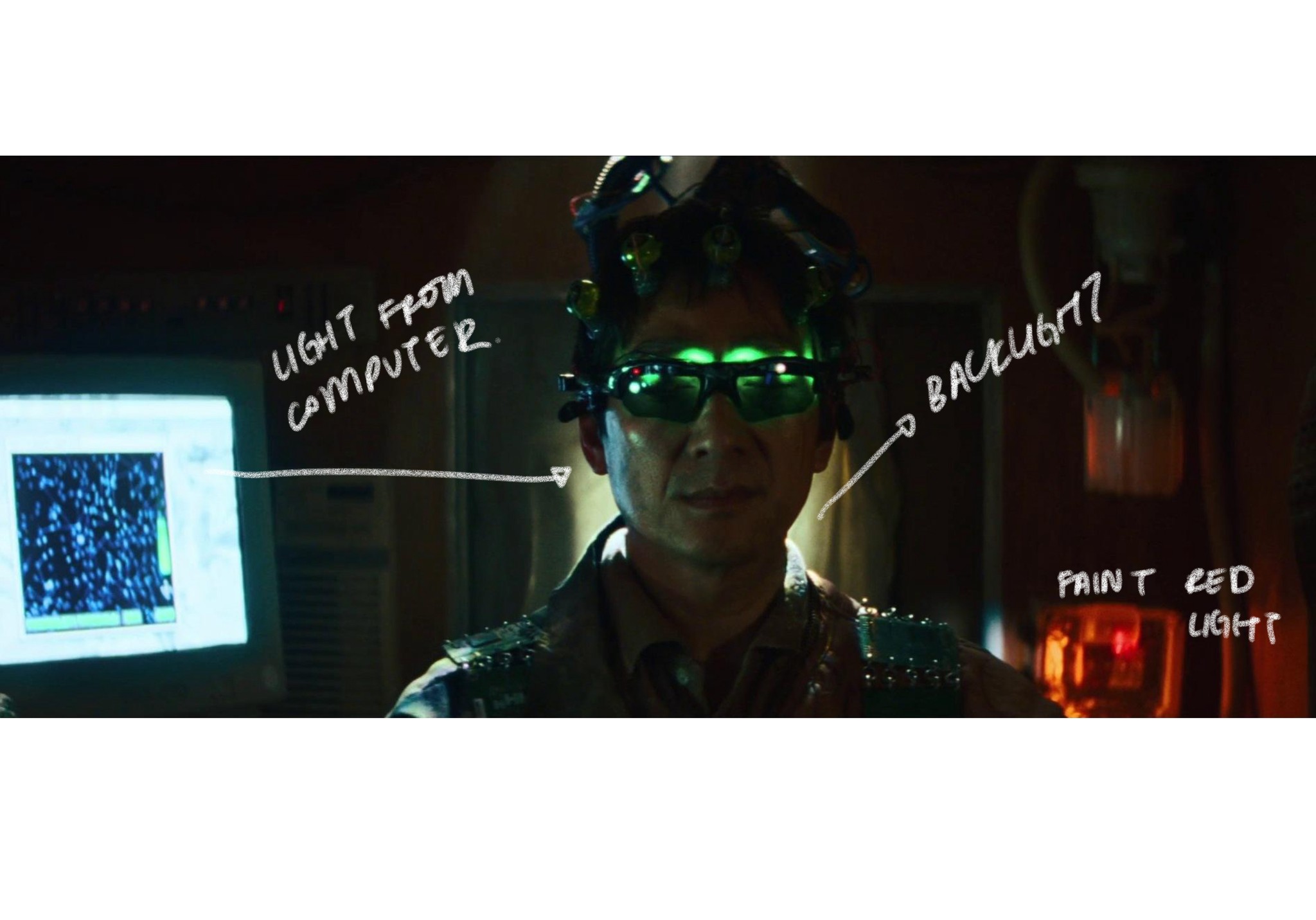The lighting appears to be partially motivated and partially surreal: the green light on the wall (that is seen in this screengrab) serves as a keylight that illuminates the left side of his face, and shrouds the right side in shadows