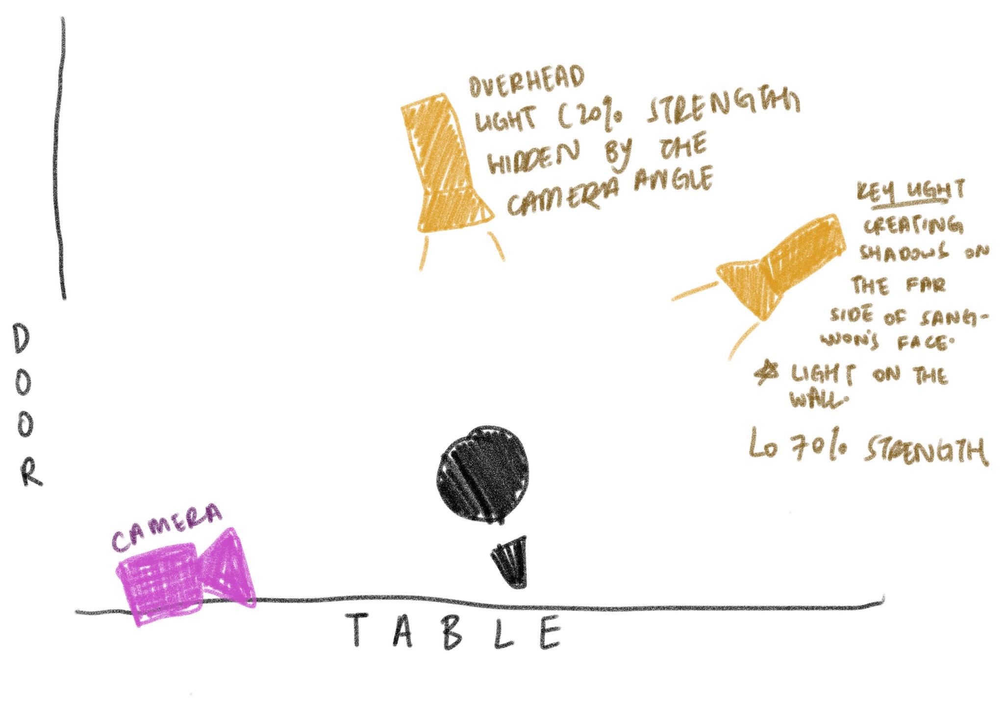 There appears to be another light overhead that is casting light on the top of Sangwon's head, and on the table. It could be a natural light existing in the scene, or an artificial light, which would make it surreal. This light is hidden by the camera angle.