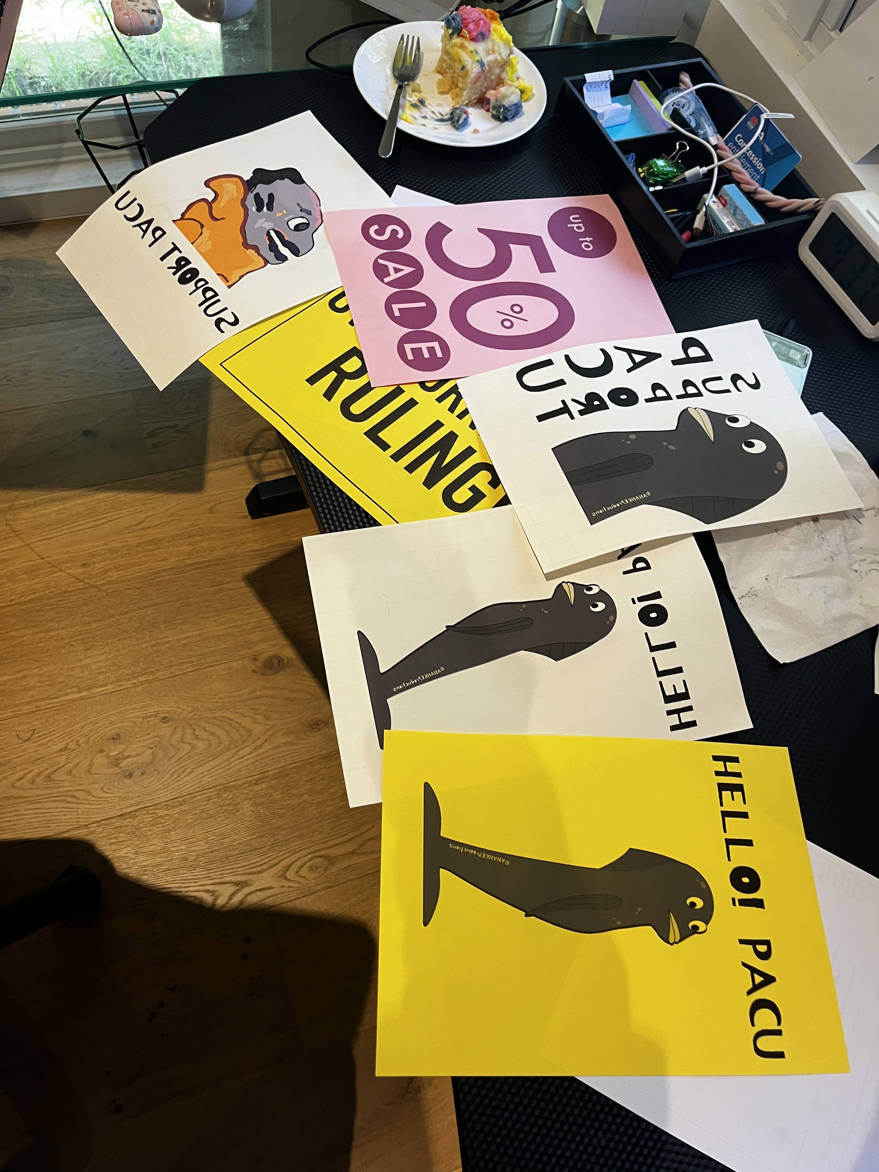 Our very lovely props, printed out on heat press paper, courtesy of my printer. Designed by Cindy & Forester, and to be ironed onto bags and t-shirts: