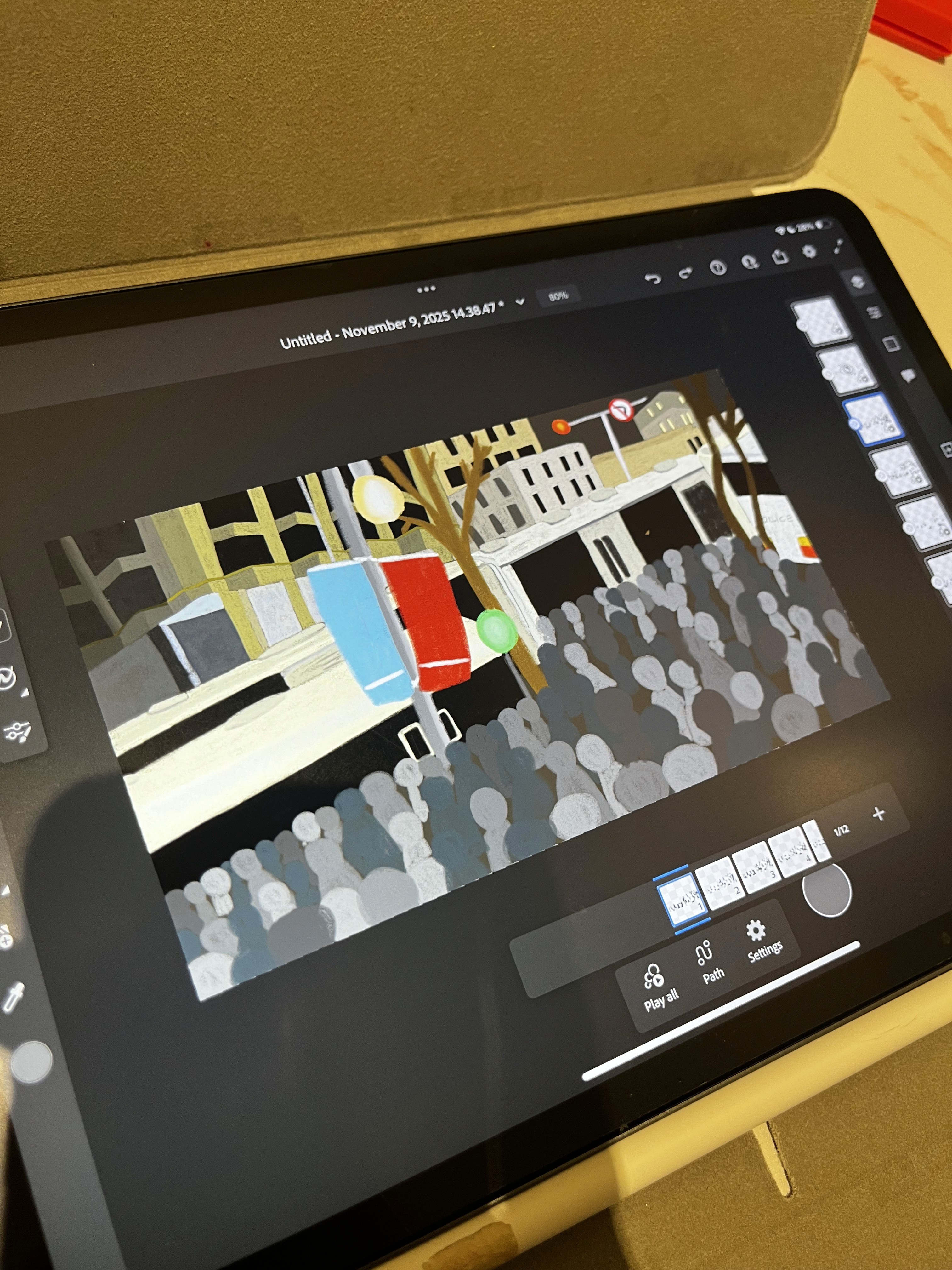 During the shoot, started the (very tedious) process of drawing the final shot of Scene 11, which involved 3 hours of drawing out the very intricate background, more hours of drawing out the crowd, and even more hours of animating every single person in the crowd individually.